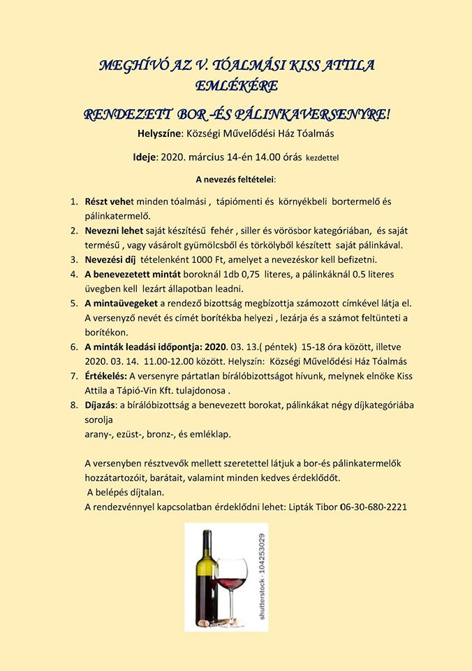 V. Tóalmási (Kiss Attila Emlékére Rendezett) Bor és Pálinkaverseny 2020 – Tóalmás