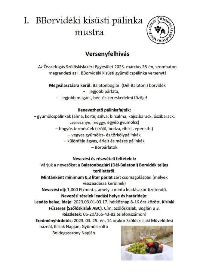 I. BBorvidéki kisüsti pálinkamusta 2023 – Szőlőskislak