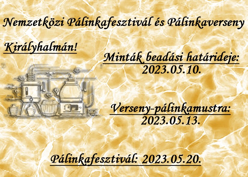2023. május 13-án megszervezésre kerül a II. Királyhalmi Nemzetközi Pálinkaverseny valamint ezt követően május 20-án a II. Nemzetközi Pálinkafesztivál. A nevezéshez szükséges mintaként fél liter pálinka, melynek nevezési díja 500 dinár mintánként.