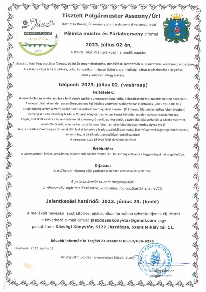XXVII. Jász Világtalálkozó Pálinkamustra és Párlatverseny 2023 – Jászdózsa